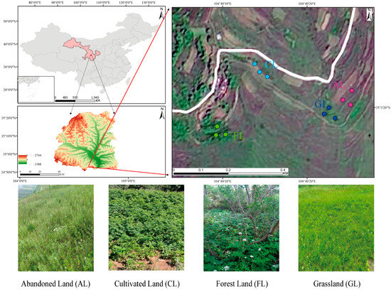 This research focused on four representative local land-use types: abandoned land (AL), cultivated land (CL), forest land (FL), and grassland (GL) (Figure 1). The AL site was previously employed for cultivation during the 1980s but was abandoned in 2008 following the cessation of agricultural activities. In the past, traditional manual farming methods were used to cultivate wheat on AL, in order to provide a source of food for local residents. For many years, CL has been conducting continuous management under the maize–potato rotation system, planting crops through a combination of animal power and mechanical tillage to achieve economic benefits. Potatoes are planted in the current season, CL has no irrigation conditions, and appropriate amounts of nitrogen and phosphorus fertilizers are applied by local farmers based on their planting experience. FL grows naturally without human disturbance, with Salix myrtillacea Andersson and Nothosmyrnium japonicum Miq as the dominant species. GL also grows naturally and is grazed year-round, with dominant plants including Fragaria vesca L., Poa pratensis L., Anaphalis flavescens Hand.-Mazz., etc.