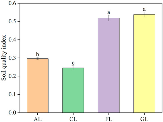 The dataset for calculating the SQI included 19 soil parameters that demonstrated significant differences (Table 1). The SQI rankings among the four land-use types were as follows: CL (0.25) < AL (0.30) < FL (0.52) < GL (0.54) (Figure 2).