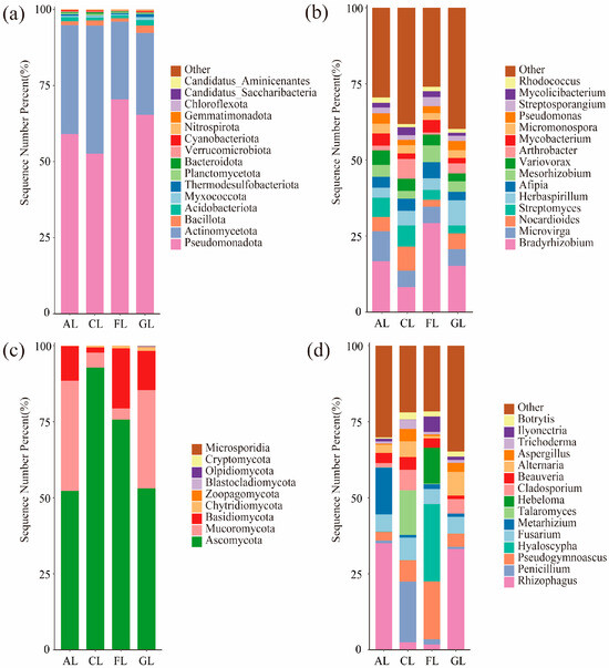 Relative abundance of soil bacteria at phylum (a) and genus levels (b). Relative abundance of soil fungi at phylum level (c) and genus level (d). AL: abandoned land; CL: cultivated land; FL: forest land; GL: grassland (feature = 15).