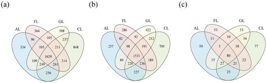 Venn diagram showing the OTUs of soil microbes (a), bacterial OTUs (b), and fungal OTUs (c) across various land-use types. AL, abandoned land; CL, cultivated land; FL, forest land; GL, grassland.