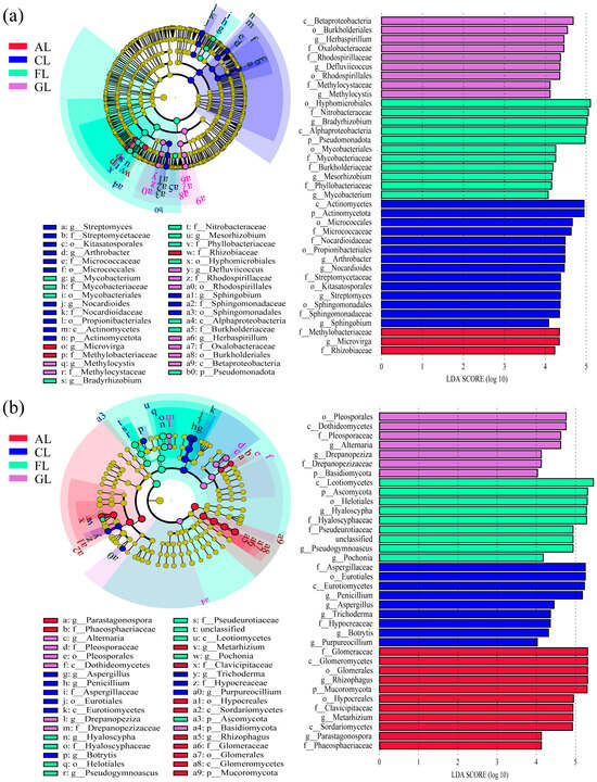 Differences in the compositions of soil bacterial (a) and fungal (b) communities under different land-use types were analyzed using linear discriminant analysis effect size (LEfSe). Each small circle at a classification level represents a taxon, with the diameter indicating the relative abundance of that taxon. Species with no significant differences are uniformly colored in yellow, while those with significant differences are represented by colored biomarkers. The names of species associated with the biomarkers are displayed on the right side, with letters and numbers corresponding to the figure. AL, abandoned land; CL, cultivated land; FL, forest land; GL, grassland.