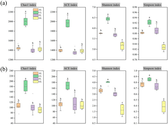 Soil bacterial (a) and fungal (b) community diversity indexes across different land-use patterns. Letters indicate significant differences in diversity (p < 0.05). AL, abandoned land; CL, cultivated land; FL, forest land; GL, grassland.