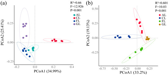 PCoA analysis based on Bray–Curtis distance (Figure 7) showed different clusters of bacterial and fungal communities across the four lands. For the bacterial community (Figure 7a), contributions of PCoA1 and PCoA2 were found to be 34.99% and 25.41%, respectively. A denser distribution was observed for the six sampling sites of AL, indicating minimal differences between the bacterial communities at these sites. Conversely, for the fungal community (Figure 7b), PCoA1 and PCoA2 accounted for 33.2% and 19.13% of the variation, respectively. Similarly, the six sampling sites in GL demonstrated a denser distribution, suggesting minimal differences among the fungal communities at these locations.