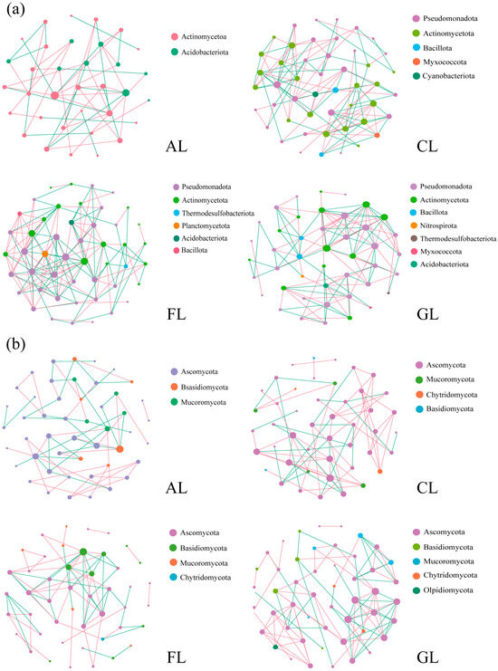 Co-occurrence networks of soil bacterial (a) and fungal (b) communities across different land-use types. AL, abandoned land; CL, cultivated land; FL, forest land; GL, grassland.