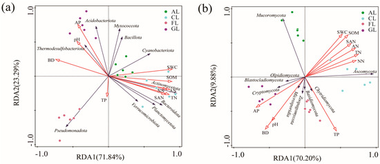 Redundancy analysis (RDA) of bacterial (a) and fungal (b) communities and physicochemical properties of soil across different land-use types. AL, abandoned land; CL, cultivated land; FL, forest land; GL, grassland; SWC, soil water content; BD, bulk density; SOM, soil organic matter; TN, total nitrogen; AN, ammonia nitrogen; NN, nitrate nitrogen; SAN, alkali-hydrolyzable nitrogen; TP, total phosphorus; AP, available phosphorus.