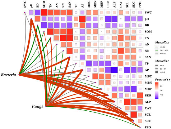 Mantel’s experiment explored the relationships between microbial diversity and soil properties across the four different land-use types. The results showed that both bacterial and fungal diversity indices were affected by soil pH, SAN, AP, UER, and ALP (Figure 10).
