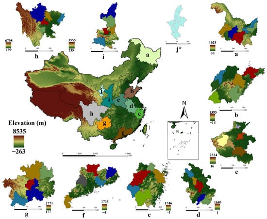 Spatial distribution of the selected provinces and cities. Notes: The colored areas were the selected provinces and selected cities. (a): Heilongjiang Province; (b): Shandong Province; (c): Henan Province; (d): Anhui Province; (e): Zhejiang Province; (f): Guangdong Province; (g): Guizhou Province; (h): Sichuan province; (i): Shaanxi Province; (j): Ningxia Hui Autonomous Region. * All cities in Ningxia were selected.