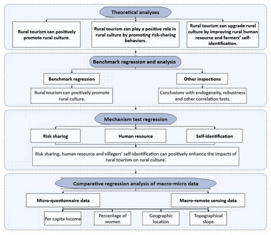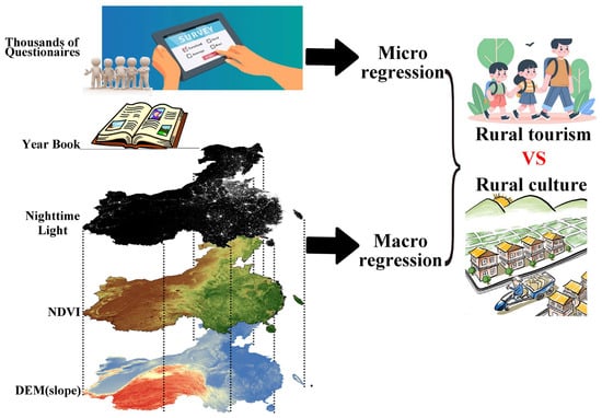 To examine the impact of rural tourism on rural culture, we chose the following models, collected questionnaires and spatial data, established multiple regressions, and compared the results via micro-level analysis and macro-level analysis (Figure 3).
