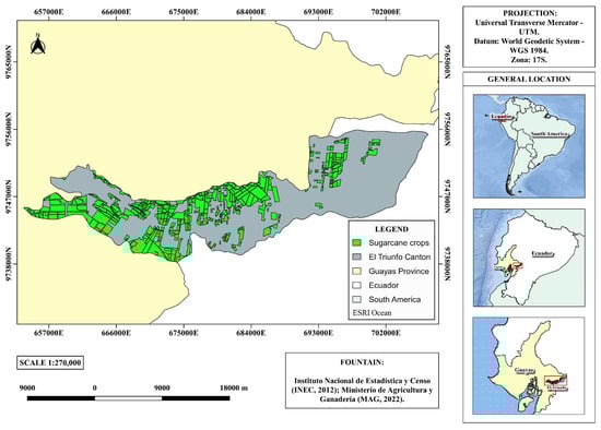 Due to its extraordinary agricultural, commercial, industrial, and livestock development, El Triunfo Canton is considered one of the most critical links in the economy of the Guayas province and the country. El Triunfo Canton has an area of 394.98 km2, of which the industrial sugarcane coverage represents the most significant extent, placing it as the leading economically productive crop by far (Figure 1). It extends over a representative area of 118.38 km2, corresponding to 29.97% of the territory [34].