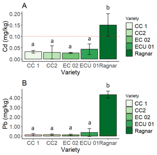 Heavy metal concentrations in sugarcane stems of the varieties ECU-01, EC-02, Cenicaña (CC1), Cenicaña with glyphosate ripening (CC2), and Ragnar. (A) Cd. (B) Pb. Results are shown as means ± standard deviations. Equal letters indicate no significant differences between the means (p > 0.05). Comparison of the Cd concentration in the sugarcane varieties with the maximum permissible limit (red line) of Cd and Pb in vegetables, according to the Codex Alimentarius FAO/OMS [44].