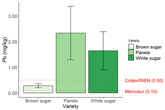 The average Pb concentrations in panela, white, and brown sugar were 2.3 ± 1.4 mg kg−1, 1.6 ± 0.74 mg kg−1, and 0.3 ± 0.08 mg kg−1, respectively, for the M1 brand. It should be noted that, even though the samples were taken from different lots and in different cities, significant contamination by Pb was observed.