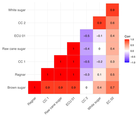 Figure 4 displays a significant correlation between the Pb concentration in white sugar and its presence in the CC2 variety (rs = 0.90). Similarly, there was a strong correlation between brown sugar and the Ragnar (rs = 1), CC1 (rs = 0.9), ECU01 (rs = 0.9), and EC02 (rs = 0.70) varieties (p < 0.05). Moreover, there was a perfect correlation between raw cane sugar and the Ragnar, CC1, and ECU01 varieties (rs = 1, p < 0.05). These findings suggest that sugar contamination may originate from the sugarcane itself.