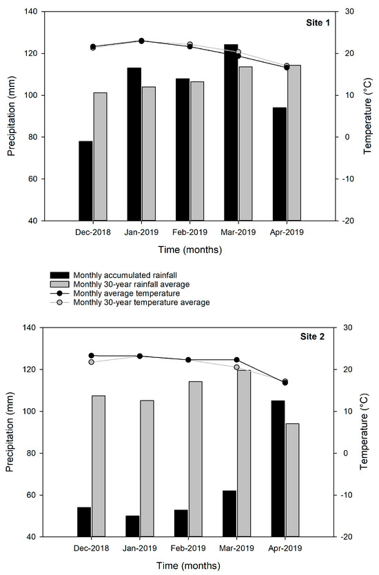 Regarding temperature records, the monthly average temperature during the crop’s critical period defined as the 15 days before and after female flowering [45] was 21.6 °C at Site 1 and 21.9 °C at Site 2. These temperatures were similar to the historical averages for the same growth period (Figure 1).