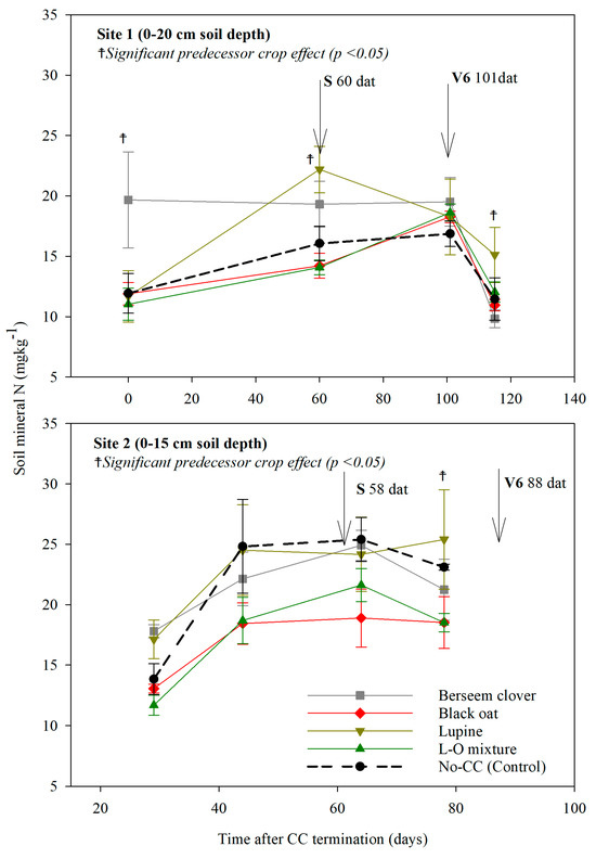 Since the interaction between the predecessor crop and sampling time was not significant (Figure 2), the average mineral N concentration across all points in time was analyzed. For this variable, the ranking of the predecessor crops from highest to lowest concentration for Site 1 was berseem clover, lupine, control, L-O mixture, and oats. In contrast, for Site 2, the ranking was lupine, control, berseem clover, L-O mixture, and oats (Figure 2).