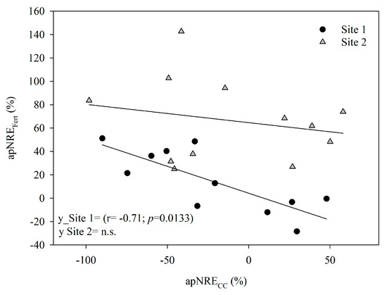 The average apNRECC was negative and similar at both sites, with values of −13% at Site 1 and −11% at Site 2. However, excluding oats, which always had negative values, the average apNRECC was 0 and 3% in Site 1 and 2, respectively. In contrast, apNREFert was consistently positive and varied between sites, reaching an average of 20% at Site 1 and 66% at Site 2. As shown in Figure 3, apNREFert exhibited more significant variability among CCs at Site 1 than Site 2, which was also reflected in the Rs values, with a significant effect from the predecessor crop (Table 6). At Site 1, a considerable negative correlation was found between apNRECC and apNREFert, suggesting that when corn received an adequate N supply from the CC (such as berseem clover), there was no significant response to N fertilization. In contrast, a positive response to fertilization was observed when the CC immobilized N, as seen with oats. Therefore, there was a positive correlation between apNREFert and the C:N ratio of the CC.