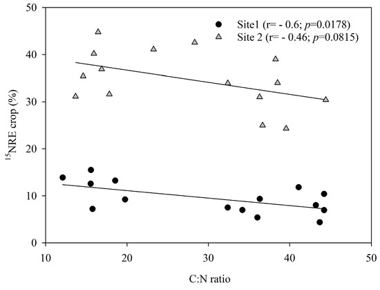 Regarding the 15N application timing, as expected, 15NRE was higher when the N supply coincided with the periods of highest N demand by the crop (V6 and V10), which are stages of rapid growth and increased N uptake. The weighted 15NREcrop was linked to residue quality. At Site 1, the highest 15NREcrop was achieved with berseem clover, which had the lowest C:N ratio. At Site 2, the highest 15NREcrop was obtained with lupine grown in monoculture or mixture, which also had favorable C:N ratios for net N mineralization in the soil (Supplementary Materials, Figure S2). However, at Site 1, weeds may have also absorbed a significant portion of the N mineralized from berseem clover.