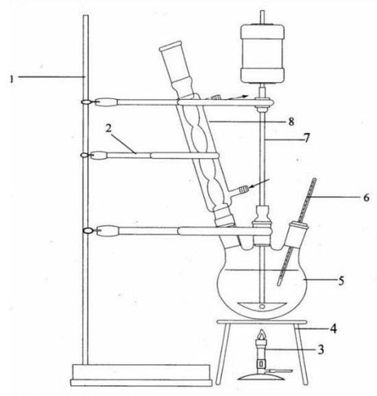 Diagram of the laboratory installation used to make the complex composition of fertilizers (1—stand; 2—clamp; 3—gas bulb; 4—tripod; 5—balloon; 6—thermometer; 7—agitator; 8—refrigerant).