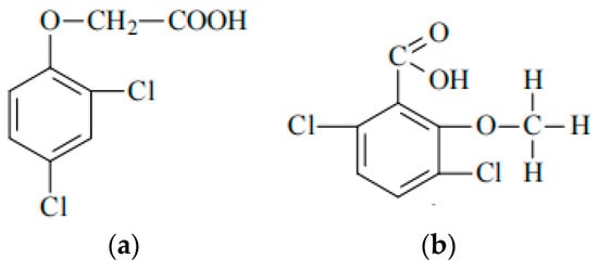 Structural formulas of: (a) 2,4-D acid; (b) Dicamba.