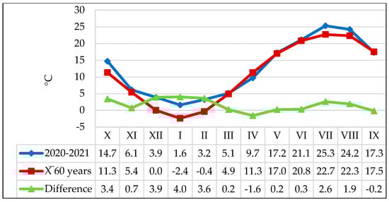 Temperatures (°C) recorded at the Moara Domneasca weather station, agricultural year 2020–2021.