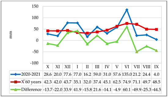 Precipitation (mm) recorded at the Moara Domneasca weather station, agricultural year 2020–2021.