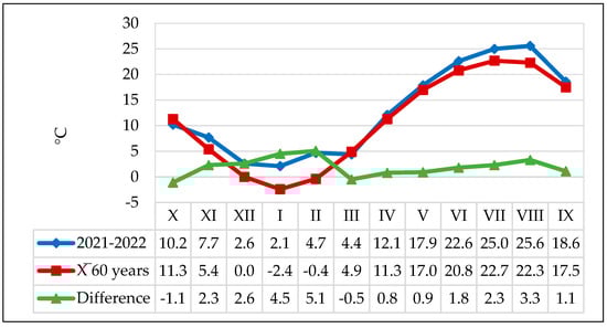 Temperatures (°C) recorded at the Moara Domneasca weather station, agricultural year 2021–2022.