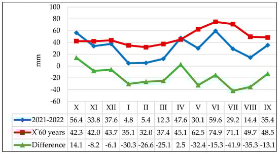 Precipitation (mm) recorded at the Moara Domneasca weather station, agricultural year 2021–2022.