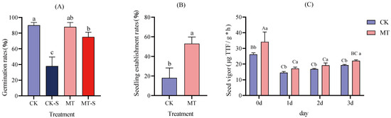 Figure 1. The germination rate, seedling establishment rate and seed vitality of cotton seed under different treatment. (A) In the simulation experiment, the germination rate of cotton seeds in different treatment. CK, the control group; CK-S, the control group in salt stress (0.4% NaCl, w/v); MT, the melatonin group; MT-S, the melatonin group in salt stress (0.4% NaCl, w/v). (B) In the pot experiment, seedling rate of cotton in different treatment. CK, the control group; MT, the melatonin group. (C) In the pot experiment, the seed vitality at the end of soaking (0 d) and after sowing for 3 days (1 d, 2 d, 3 d). CK, the control group; MT, the melatonin group. Different lowercase letters indicate statistically significant differences between different treatments at the same time, and uppercase letters represent the comparison between different times of the same treatment (n = 5, p < 0.05). Error bars represent the standard deviation.