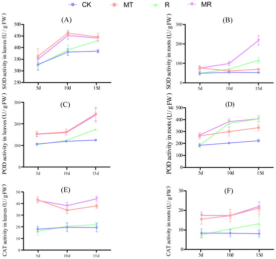 As shown in (Figure 2A,C,E), during the cultivation period, the enzyme activities of POD and CAT in cotton seedling leaves in the melatonin groups (MT and MR) were significantly higher than that in CK and R groups, respectively. However, the enzyme activities of SOD in the melatonin groups (MT and MR) were significantly higher than that in CK and R groups, respectively, but this only occurred on the 10th day. On the 15th day, the enzyme activities of SOD, POD, and CAT in cotton seedling leaves in the R group were higher than those in the CK group but lower than those in the MT group, while the MR group exhibited the highest values among all groups. In the roots (Figure 2B,D,F), just like the leaves, the enzyme activities of POD and CAT in the melatonin groups (MT and MR) were significantly higher than those in the CK and R groups, respectively, during the cultivation period. On the 15th day (Figure 2B,D,F), the activities of SOD, POD, and CAT in leaves in the MT group were significantly higher than those in the CK group. However, the activities of SOD and POD in the R group were significantly higher than those in the MT group; whereas the activities of SOD, POD, and CAT in the MR group were the highest values out of all the groups. Especially, the SOD activity in MR was significantly enhanced than that in R or MT on the 15th day.