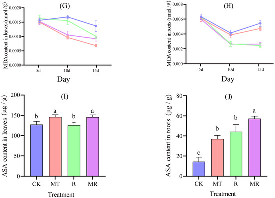 Figure 2. The levels of antioxidants and peroxide in the leaves (A,C,E,G,I) and roots (B,D,F,H,J) of cotton seedlings. SOD, superoxide dismutase; POD, peroxidase; CAT, catalase; ASA, ascorbic acid; MDA, malondialdehyde. Different lowercase letters indicate statistically significant differences (n = 3, p < 0.05). Error bars represent the standard deviation.
