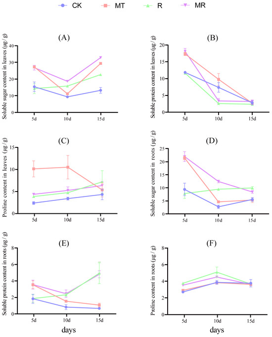 As depicted in Figure 3A, the levels of soluble sugars in cotton leaves exhibited an initial decline followed by a subsequent increase in the CK, MT and MR groups, except for the R group, which displayed a consistent upward trend. On the 15th day, the soluble sugar content in three groups (MT, R and MR) was higher than that in CK, respectively, with the MR group showing the highest value (increased by150.7% compared to CK, p < 0.05); meanwhile, from the 5th to the 15th days, there was a gradual decrease in the soluble sugar content in the roots of all treatment groups (Figure 3D). On the 15th day, both the R and MR groups exhibited significantly higher levels of soluble sugar content compared to the MT and CK groups (p < 0.05).