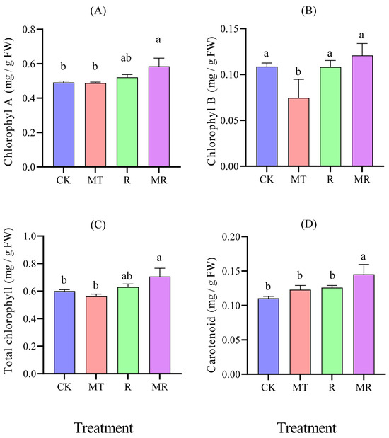 As shown in Figure 4A,D, compared to CK, only the MR group exhibited a significant increase in the levels of chlorophyll A and carotenoids in cotton seedling leaves (p < 0.05), respectively. Among all four groups, MR displayed the highest content of chlorophyll A, chlorophyll B, total chlorophyll, and carotenoids. The MT group had a significantly decreased content of chlorophyll B compared to the CK group, but it had no significant effect on the levels of chlorophyll A, total chlorophyll, and carotenoids (Figure 4A–D).