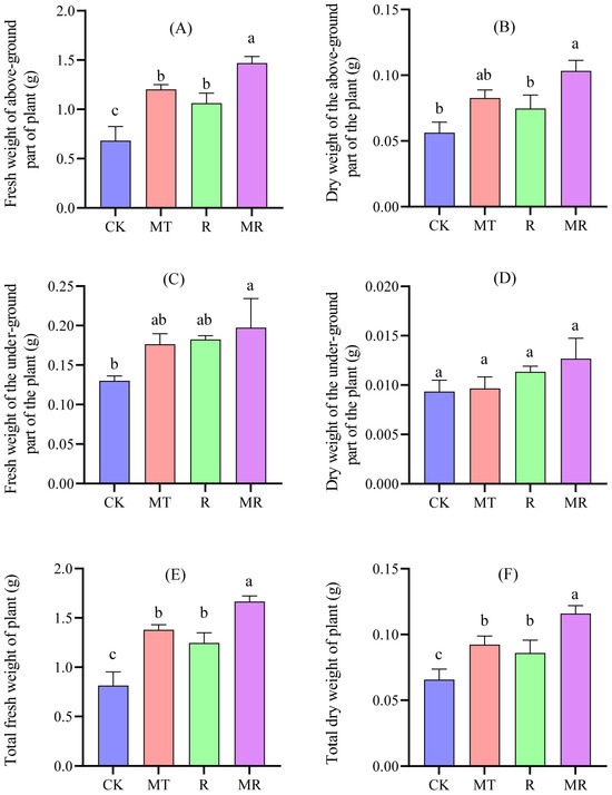 Figure 5. Biomass of cotton seedling on the 15th day in different treatments: (A) fresh weight of the aboveground parts; (B) dry weight of the aboveground parts; (C) fresh weight of the underground parts; (D) dry weight of the underground parts; (E) total fresh plant weight; (F) total dry weight of the plant. Different lowercase letters indicate statistically significant differences (n = 3, p < 0.05).