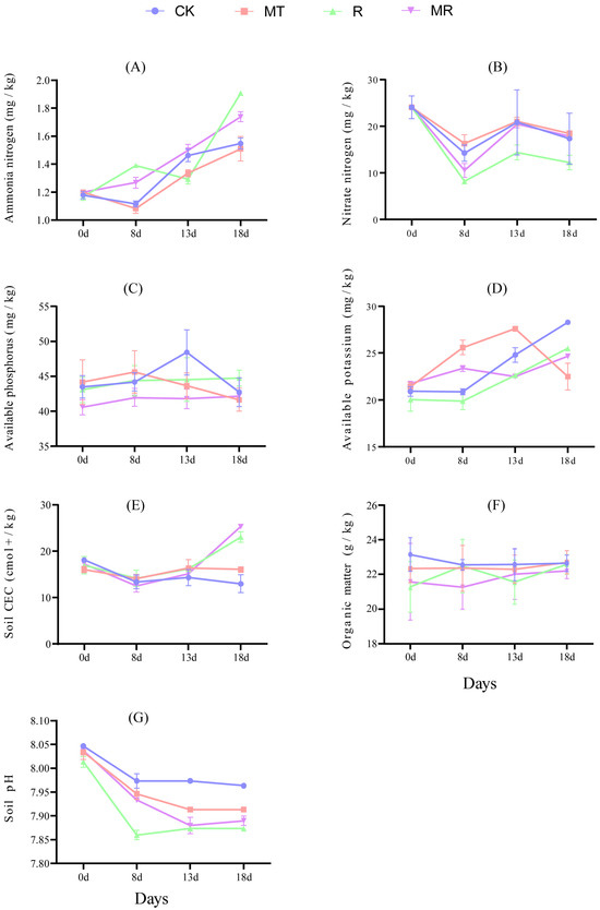 As depicted in Figure 6A, the ammonia nitrogen content in the soil of the R and MR groups on the 8th and 18th days exhibited a significant increase compared to that of the CK and MT groups, respectively. During the cultivation, the ammonia nitrogen content in the MT group showed no significant difference compared to that in the CK group (Figure 6A). MT did not exhibit a significant effect on nitrate nitrogen content, while R significantly reduced the soil nitrate nitrogen content compared with the CK group on the 8th and 18th days (Figure 6B). On the 0–18th days, the concentration of available phosphorus in the RAE groups (R and MR) sustained a comparative stability, whereas in the CK and MT groups, it underwent an initial increase followed by a decrement. Moreover, from the 13th day to the 18th day, the content of available phosphorus in the MT group was lower than that in the CK group (Figure 6C). Concomitant with the application of potassium chloride solution, there was a marked ascension in the available potassium content in the CK and MT groups over the course of the 0–13th days. Notably, the MT group experienced a subsequent significant decline on the 18th day. Conversely, the RAE group exhibited a consistent rise in available potassium from the 8th to the 18th day. A stable ascending trajectory was showed in MR from the 13th and the 18th days (Figure 6D). In comparison with CK, both R and MR groups significantly increased the cation exchange capacity of soil on day 18 (Figure 6E). Compared with CK, the R group significantly reduced soil pH and reached the lowest value on day 8, and the three treatments (R, MT, MR) significantly reduced soil pH on day 13 and day 18 with the largest reduction in the R group (Figure 6G). There was no significant change in soil organic carbon content in all treatments (Figure 6F).
