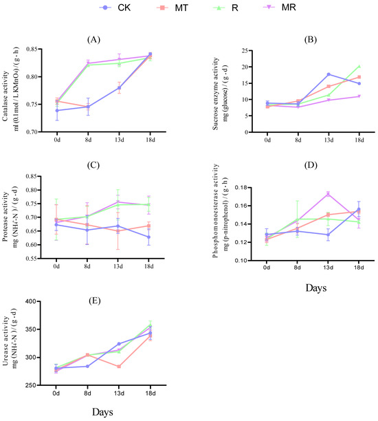 Figure 7. Soil enzymes activities during the cultivation of cotton seedlings in different treatments. (A) Protease, (B) catalase, (C) phosphomonoesterase, (D) urease (E) sucrase.