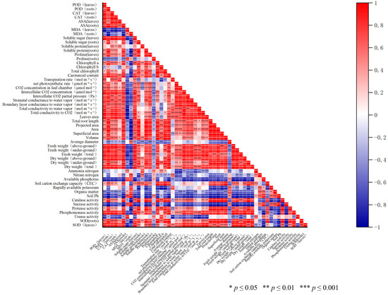 Figure 8. Correlation analysis between physiological and agronomic indexes of cotton seedling and physicochemical properties of rhizosphere soil. Spearman’s correlation coefficient was used for the correlation analysis, p < 0.05.