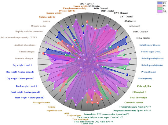 It was observed that compared to CK (Table 3), the MT group had a significantly increased transpiration rate of the leaves and moderately enhanced net photosynthetic rate, intercellular CO2 concentration, leaf area, total conductance to water vapor, and total conductance to CO2 (p < 0.05), respectively. The R group had a significantly improved net photosynthetic rate and leaf chamber CO2 concentration as well as moderately increased intercellular CO2 concentration, intercellular CO2 partial pressure, leaf area, stomatal conductance to water vapor, and boundary layer conductance to water vapor, but it had a notably decreased transpiration rate. Compared to the CK group, the MR group significantly enhanced the transpiration rate (49%, p < 0.05), net photosynthetic rate (47.1%, p < 0.05), leaf chamber CO2 concentration (47%, p < 0.05), intercellular CO2 concentration (80.3%, p < 0.05), intercellular CO2 partial pressure (33.3%, p < 0.05), leaf area (33.7%, p < 0.05), stomatal conductance to water vapor (42.9%, p < 0.05), boundary layer conductance to water vapor (50%, p < 0.05), total conductance to water vapor (34%, p < 0.05), and total conductance to CO2 (39.6%, p < 0.05).