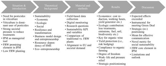 The methodology encompasses not only quantitative measures of pesticide reduction and cost savings but also incorporates an analysis of social sustainability, especially regarding the mental pressure in viticulture and increased degree of freedom with a positive impact on work–life balance. This comprehensive evaluation is novel in that it extends beyond conventional ecological and economic indicators, highlighting the potential of FRW to enhance the quality of life for vineyard managers and workers.