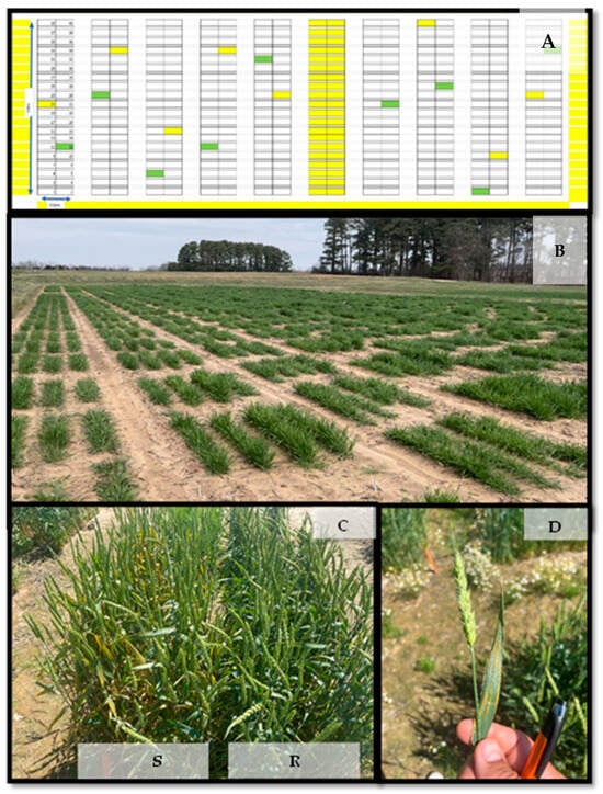Every tray included two control cultivars: Pat, a tolerant line, and CG514W, a highly susceptible line to stripe rust. These controls were randomly placed within the trays to serve as checks throughout the study. To control weeds and pests, herbicides and insecticides were applied as needed, following protocols provided by the University of Arkansas Extension Center. These management practices ensured that environmental factors did not interfere with wheat performance or disease evaluation. Additionally, to increase the chance of infection throughout the field, the susceptible lines were used as spreaders planted around the field and within rows (Figure 1).