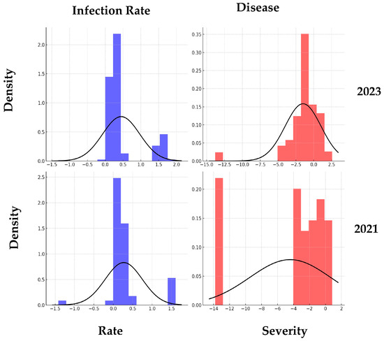 Infection rate and disease development in 2021 and 2022, 2023 studies. X-axis (Infection Rate): the rate of infection observed in the different samples or lines; Y-axis (Density): the density or frequency distribution of the infection rates; X-axis (Disease): the amount or severity of the disease for each sample or observation; Y-axis (Density): the density or relative frequency of the amount of disease observed in the data.