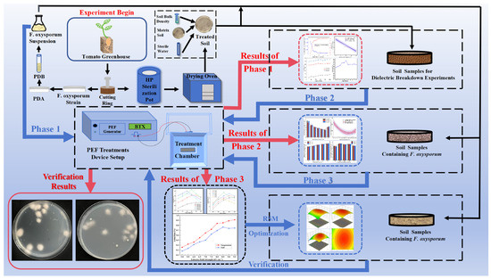 The experimental workflow adhered to the sequence was depicted in Figure 1. Initially, experiments in F. oxysporumin suspension were conducted, denoted as phase one. This was followed by the second phase, in which experiments were focused on soil dielectric breakdown field strength. Utilizing the parameters obtained from the two phases, soil sterilization experiments were performed by leveraging pulsed electric field. A comprehensive description of the experimental design is presented in the subsequent sections.