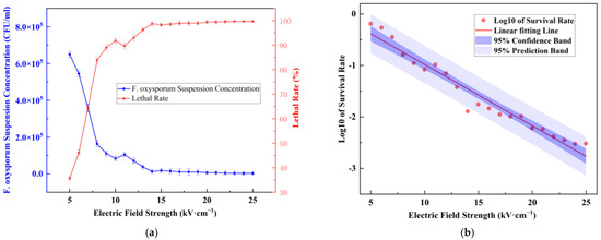 Effect of PEF treatment on the lethality of F. oxysporum in suspension; (a) concentration of F. oxysporum after PEF treatments with an EFS ranging from 5 to 30 kV·cm−1, with inc. of 5 kV·cm−1; (b) linear regression analysis of electric field strength and Log10 value of survival rate of F. oxysporum, with a confidence level of 95% (p < 0.05).