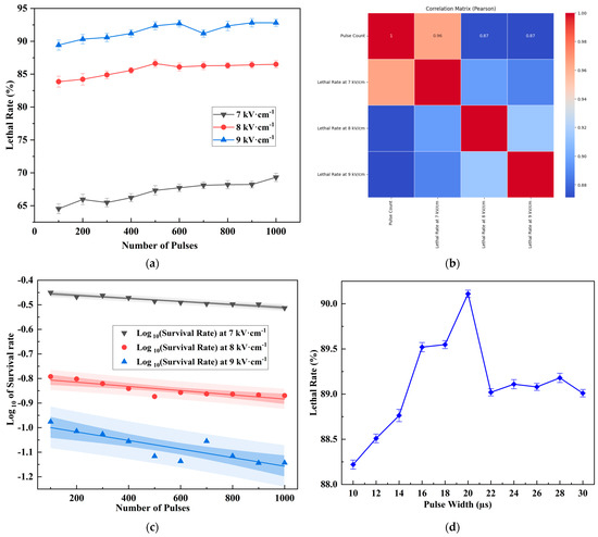 The calculation results of the Pearson correlation coefficient further confirmed this positive correlation, with values of 0.966, 0.873, and 0.873, respectively, indicating a very strong correlation between the number of pulses and the lethal rate, as shown in Figure 3b. Linear regression analysis in Figure 3c revealed a significant negative correlation between the number of pulses and Log10 of survival rate (p < 0.05), and regression models were obtained. The regression models at EFS of 7, 8, and 9 kV·cm−1 are listed below, respectively. These results indicate that increasing the number of pulses is an effective strategy to enhance the lethal rate, with the most significant effect observed at lower electric field strengths.