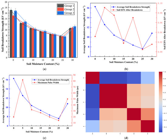 Impact of soil moisture content on the soil dielectric breakdown strength; (a) soil breakdown strength with soil moisture content ranging from 0 to 30%, with inc. of 5%; (b) average soil break strength and electric field strength maintained in soil after dielectric breakdown with different soil moisture content; (c) maximum pulse width under maximum electric field strength maintained in soil with different soil moisture content; (d) a Pearson correlation heatmap illustrating the relationship between soil moisture content, average breakdown strength, median breakdown strength, soil field strength after breakdown, and the maximum pulse width when breakdown does not occur, where A is soil moisture content, B is average soil breakdown strength (kV·cm−1), C is median soil breakdown strength, D is soil EFS after breakdown, and E represents the maximum pulse width that can be utilized without causing soil dielectric breakdown.