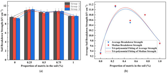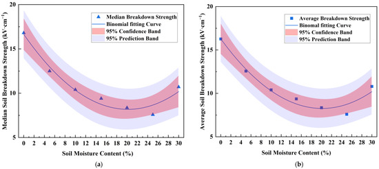 Based on this, regression analysis was performed on the average and median breakdown strengths at different moisture contents, as shown in Figure 5a,b. The determination coefficient (R2) for average soil breakdown strength is 0.9596, while it is 0.9624 for the median soil breakdown strength, indicating that soil breakdown strength under the test conditions fits very well with the quadratic regression model. The regression equations for average soil breakdown strength and median soil breakdown strength are listed below: