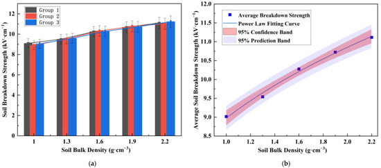 Under the condition of constant soil bulk density (1.3 g·cm−3), PEF with a pulse interval of 100 ms, pulse width of 10 µs, and a total of 100 pulses were used to treat soils with different soil moisture contents (0–30%, with 5% increments). The results indicate that the soil breakdown strength varies significantly with moisture content (p < 0.05), as shown in Figure 4a. When the soil moisture content increases from 0% to 25%, the soil breakdown strength significantly decreases, with the mean value dropping from 16.8 kV·cm−1 to 7.58 kV·cm−1. Meanwhile, the rate of decrease in soil breakdown strength slows down during this process, showing two distinct phases. When the moisture content increases from 0% to 10%, the breakdown strength decreases rapidly with the increase in moisture content, with a decrease of about 0.64 kV·cm−1 for every 1% increase in moisture content. However, when the moisture content increases from 10% to 25%, the decrease in soil breakdown strength is significantly smaller, with a change of about 0.28 kV·cm−1. When the moisture content increases from 25% to 30%, the soil breakdown strength increases rapidly, with the mean value increasing from 7.58 kV·cm−1 at 25% moisture content to 10.7 kV·cm−1 at 30% moisture content. At the same time, the difference in the dielectric breakdown strength of dry soil in Figure 4a is greater than the differences under other moisture content conditions, indicating that soil moisture content is an important factor affecting the soil breakdown strength.