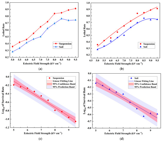 The results of the correlation analysis indicate a strong positive correlation between electric field strength and fungal survival rate (correlation coefficient r > 0.95, p < 0.01), suggesting that electric field strength is a key factor affecting fungal mortality rate. Additionally, analysis of variance (ANOVA) confirmed that the differences in mortality rates among different electric field strength groups are statistically significant (F > 10, p < 0.01), further confirming the significant impact of electric field strength on the fungal mortality rate. Given the significant correlation between EFS and the lethal rate of F. oxysporum, a Log10 transformation was applied to the mortality rate, followed by linear regression with R2 = 0.95. The result is showed in Figure 2b, and the linear regression equation is: