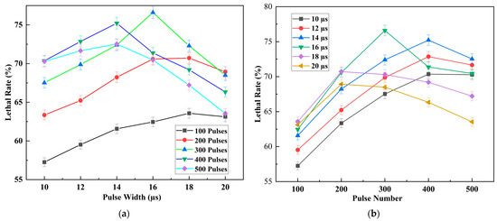Subsequently, with a pulse width of 30 µs and a pulse interval of 100 ms, the experiment utilized pulse counts from 100 to 1000, incrementing by 100 pulses under EFS of 7, 8 and 9 kV·cm−1 to assess the effect of the number of pulses, as presented in Figure 3a. From 100 to 200 pulses, the lethal rate at the electric field strength of 7 kV·cm−1 increased by 2.18%; at 8 kV·cm−1, it increased by 0.43%; and at 9 kV·cm−1, it increased by 1.01%. As the number of pulses continued to increase, the rate of increase in the lethal rate slowed down at an EFS of 7 kV·cm−1 and 8 kV·cm−1. At an EFS of 9 kV·cm−1, the rate of increase decreased in the 500 to 600 pulse range and then resumed its upward trend. However, the rate of increase still remains lower than that between the 100 to 500 pulse range. This suggests that a finite number of pulses significantly enhances the germicidal rate, but there may be a threshold [63]. Under the electric field strength of 9 kV·cm−1, a significant decrease of 1.63% in the lethal rate occurred within the 600 to 700 pulse range, which may be related to fluctuations in experimental conditions or other uncontrolled variables. Overall, the lethal rate increased with the increase in the number of pulses, indicating that increasing the number of pulses can effectively improve the efficiency of sterilization. Additionally, the range of pulse numbers in existing studies varies in different orders of magnitude, from a few to tens of thousands [28,29,32,33], which may be related to different microbial species and combinations of electric field parameters. The experimental results further confirm this point. Therefore, it is necessary to conduct a more in-depth interactive study on the relationship between pulse number and sterilization rate to determine the optimal pulse number under different conditions, thereby optimizing the sterilization process.