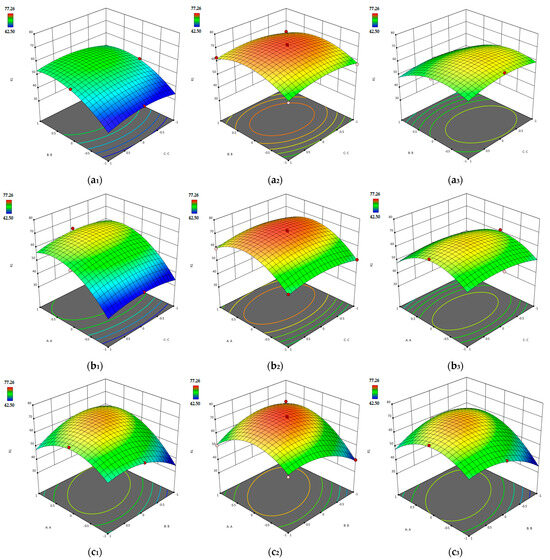 The employment of response surface methodology (RSM) entails the development of a regression model that encapsulates the effects of the experimental factors on the response variables and also considers the complex nonlinear interactions between those factors. A second-order polynomial regression model was utilized to model the relationship between PEF factors and lethal rate of, as shown in Equation (5) below: