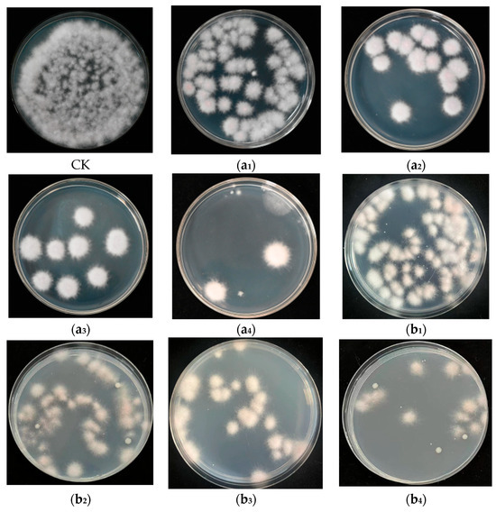 Preparation of F. oxysporum suspension: F. oxysporum colonies were cultivated in PDA media at 25 °C for 7 days. Subsequently, these colonies were employed as inocula (microconidia). The inoculum was subsequently introduced into PDB media and incubated on a shaking bed at 28 °C for a period ranging from 3 to 5 days. The conidia concentration of F. oxysporum in the suspension was periodically assessed in every 24 h and adjusted throughout this process until it reached a range of 106 to 107 colony-forming units per milliliter (CFU·mL−1). The resulting suspension was preserved at 4 °C for future use. Prior to each experiment, the concentration of the suspension was recounted to ensure consistency, and pour plate cultivation was performed to cultivate control groups. This procedure was implemented to guarantee that the viability of the suspension met the requirements for the experiments.