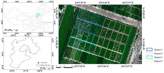 The experiment was conducted in Chabei, Zhangjiakou, Hebei Province, China, in 2023 (Figure 1). This region is located in the temperate arid and semi-arid zone of East Asia’s continental monsoon climate, with an altitude of 1390 m. The soil type is calcium chestnut. Two potato varieties, Zhongshu 5 and Zhongshu 49 (D681), were used in the experiment, along with five nitrogen fertilizer treatments (0, 50, 100, 250, and 400 kg·ha−1), each with four replications. The crops were sown on 5 May and harvested on 8 September. Eight ground control points (GCPs) were placed around the experimental field, and the three-dimensional coordinates of the GCPs were determined using high-precision RTK GPS.